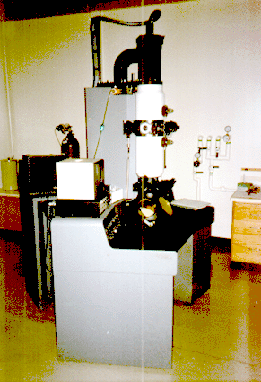 The Philips EM 430 transmission electron microscope. Upper left of control panel has the Gatan camera electronics module and monitor. This microscope routinely resolves under 3.0 Å. The images are captured by the Gatan camera through a YAG crystal and sent to our IBAS digital image processing computer.