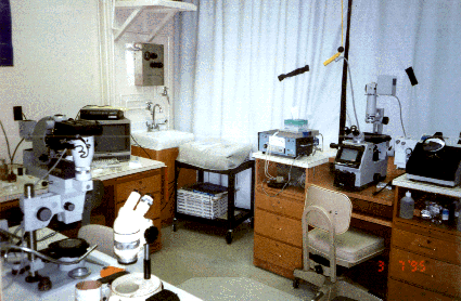 Note the modular cabinets designed for specific light microscopy applications. This room is supplied with filtered air. At the right is a Zeiss inverted microscope and a Leitz micromanipulater. A thermoelectric microscope stage is on the left side of this unit. To the left is a stereoscopic binocular microscope. In the rear of the room is a Zeiss Universal microscope and a new Optronics Video system with a Panasonic Video Disc Recorder.