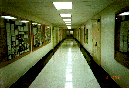 View of the second floor of Painter hall with R. Malcolm Brown's lab exhibits (posters) displayed.