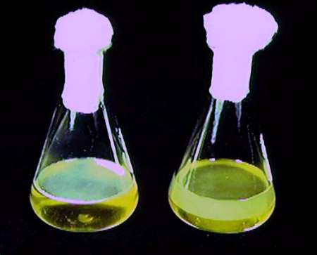 . The flask at the left has a thin membrane, while the flask at the right has a thick leathery pellicle membranes of cellulose. The bacteria are entrapped within the pellicle. The most