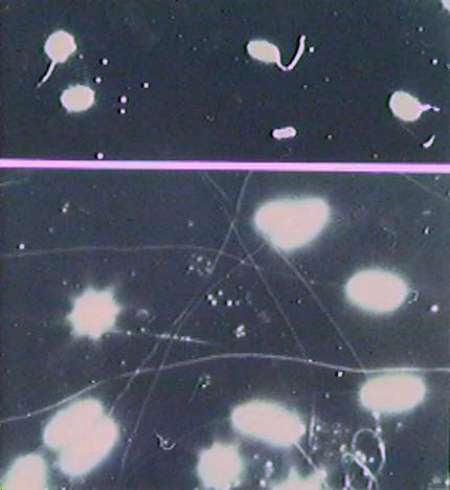 This plate consists of two darkfield light micrographs showing living Acetobacter cells at the initiation of cellulose
