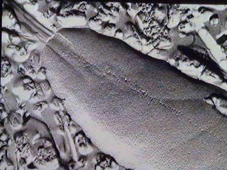 This is a freeze fracture replica which has been imaged with a transmission electron microscope, showing a portion