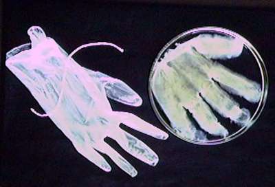 The Acetobacter cells produce and exact cellulose replica of the PVC glove! This is due to the oxygen-rich interface